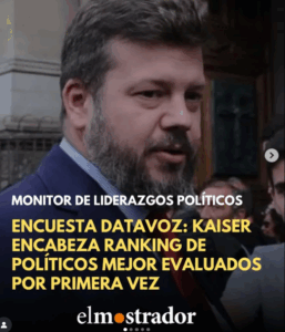 El medio digital El Mostrador publicó los resultados del último Monitor de Liderazgos Políticos de Datavoz, donde el diputado Johannes Kaiser se posiciona por primera vez en el primer lugar del ranking de menciones espontáneas positivas, con un 31,6 %, superando a José Antonio Kast.